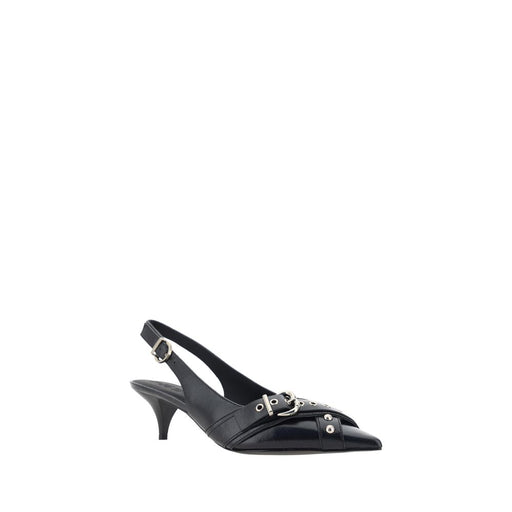 Original price $454.44Current price $396.01| /Buckle Ballerinas by Ganni featuring elongated toe, two adjustable front buckles, block sole, slingback style, patent leather design.