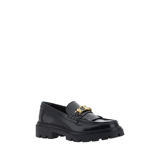 Original price $962.98Current price $742.25| /Calfskin Loafers by Tod’s, slightly elongated round toe, rubber block heel, iconic metal plaque appliqué on front tray, logo-embossed insole.