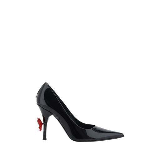 Original price $1,157.74Current price $784.45| /Leather Pumps by Magda Butrym, patent leather design, elongated toe, leather stiletto heel with 3d flower applique detail, logo insole.