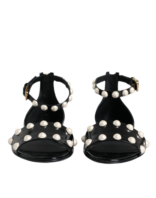 Dolce & Gabbana Black Keira Leather Faux Pearl Sandals Heels Shoes