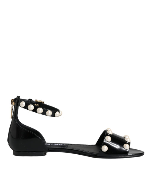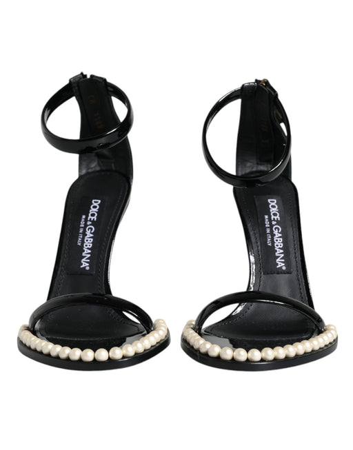 Dolce & Gabbana Black Leather Pearls Ankle Strap Sandals Shoes