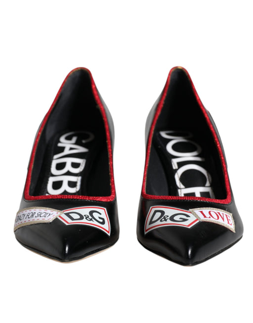 Dolce & Gabbana Black Leather Logo Print Heels Pumps Shoes