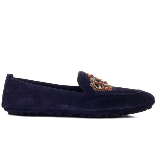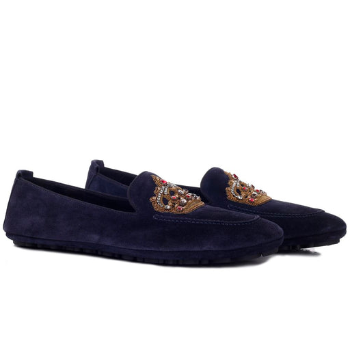 Original price $892.75Current price $700.57| /Dolce & Gabbana dark blue suede calfskin loafers with jeweled and lurex crown decoration, matelassé interior with printed logo