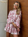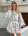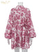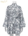 Casaul Loose Print Women'S Dress Fashion Stand Collar Puff Sleeve Mini Dresses Elegant Lace-Up Pleated Female Dress