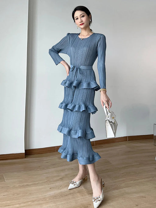 Long Pleated Dress Women Round Neck Solid Color Ruffles Belt Dresses Multi-layer Female Elegant Clothing