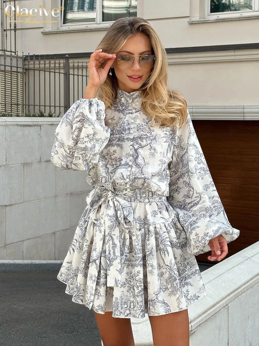 Casaul Loose Print Women'S Dress Fashion Stand Collar Puff Sleeve Mini Dresses Elegant Lace-Up Pleated Female Dress