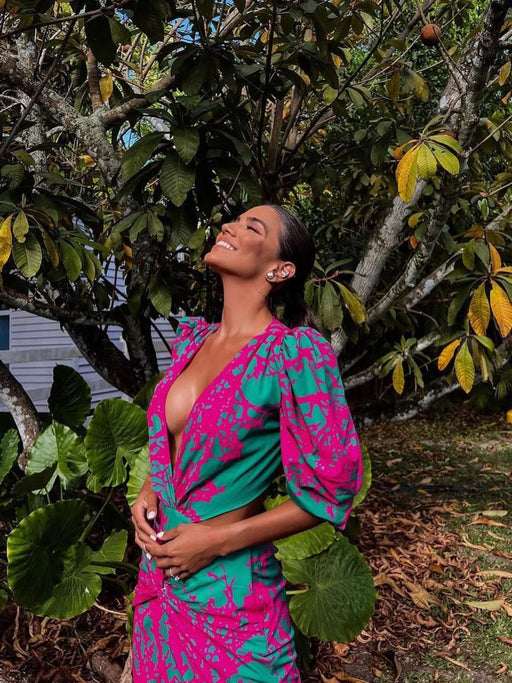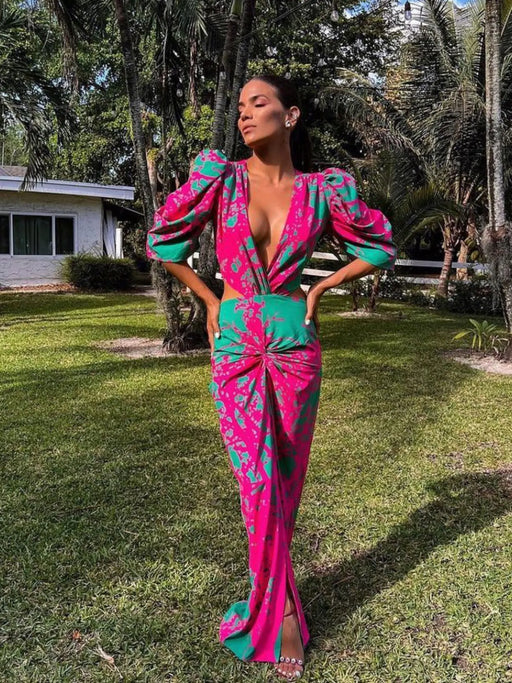 V Neck Dress Women Elegant Print Cutout Short Puff Sleeve Long Dress Summer Bodycon Evening Party Clothing