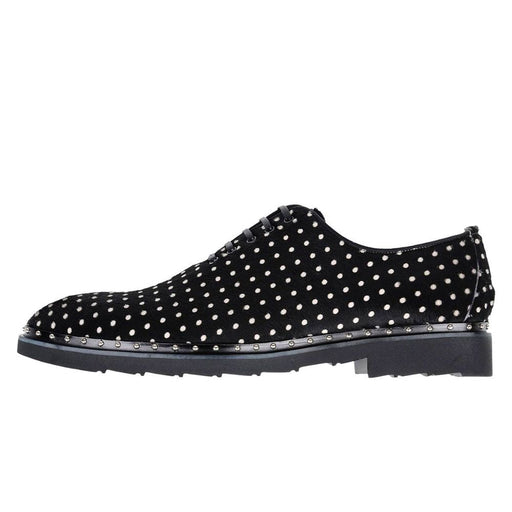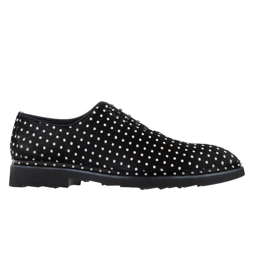 Original price $827.73Current price $636.87| /Dolce & Gabbana calfskin lace-up derby shoes covered in pony skin with polka dot print, stud decoration all along the sole.3 cm heel sole