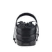 The Rise Bucket Bag by Alexander McQueen, caged exterior structure made of leather, fabric interior lining with drawstring closure, flat and round leather top handle, iconic brand signature printed pressure on the front.