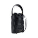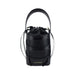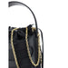 Calfskin The Rise Mini Bucket Bag by Alexander McQueen, adjustable drawstring closure, flat top handle, removable chain shoulder strap, contrasting iconic brand monogram on front, single interior compartment, cut-out details on front and back.
