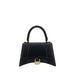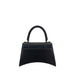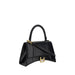 Calfskin Hourglass Handbag by Balenciaga, rigid top handle at top, magnetic flap closure at front, adjustable and removable shoulder strap, gold-plated iconic brand monogram plaque embossed on front, removable and adjustable flat shoulder strap, patent leather design.