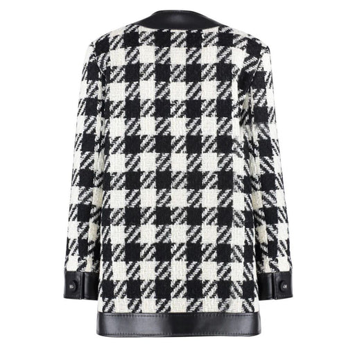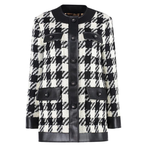 Original price $2,141.90Current price $1,184.54| /Dolce & Gabbana wool houndstooth coat jacket, four-pocket design, calfskin leather details. Made in Italy