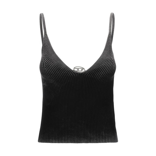 Original price $345.78Current price $291.68| /Cotton M-Laila Top by Diesel, cropped sleeveless design, thin shoulder straps, ribbed design, V-neck front, three-dimensional iconic brand logo pla...