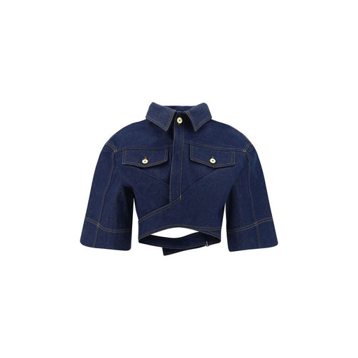 Original price $594.64Current price $443.16| /Denim de-Nimes Top by Jacquemus, cropped model with short sleeves, classic collar, front button closure, two welt pockets on front with flap and bu...