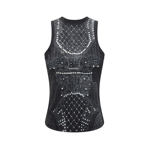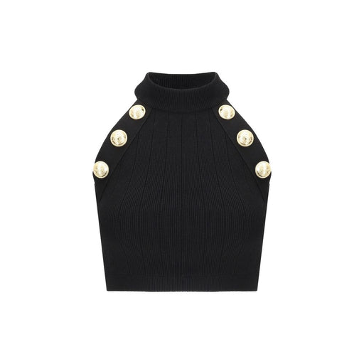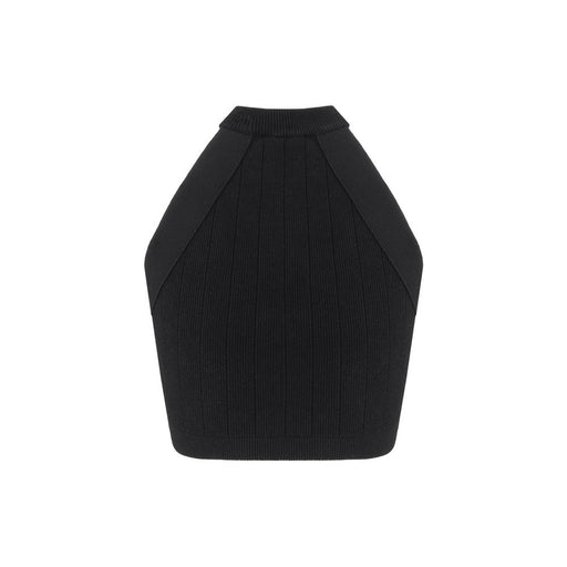 Original price $1,049.54Current price $846.12| /Top by Balmain, cropped sleeveless style, ribbed design with all-over repeated perforated details, ribbed crew neck, contrasting applied lion’s hea...