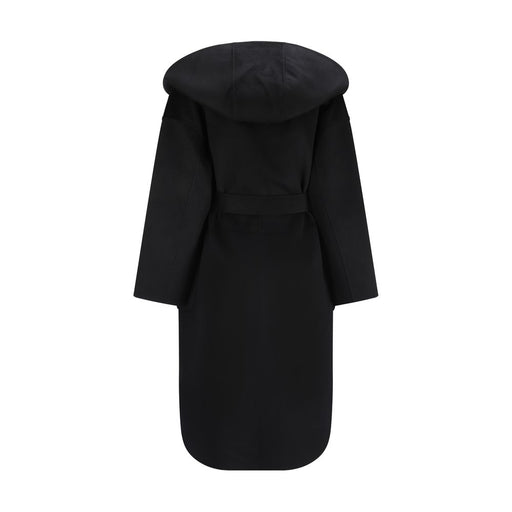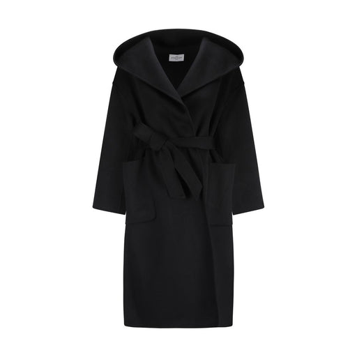 Original price $702.84Current price $525.39| /Wool Fargo Coat by Dynamis Studio, hooded design, shawl lapels, front closure by knotted sash waistband, two side welt pockets, monochrome pattern.