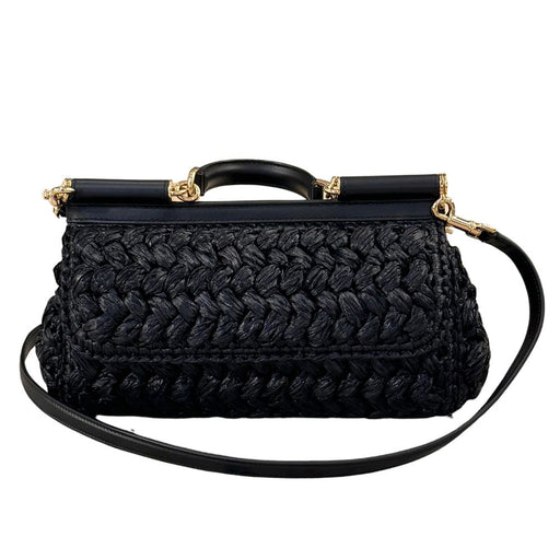 Original price $2,143.27Current price $1,669.48| /Dolce & Gabbana bag in black raffia and calfskin. Front opening with flap, spotted fabric interior and zip pocket. Rigid leather top handle and...
