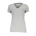 Elevate your everyday look with a touch of Guess Jeans chic! This sleek gray T-shirt exudes casual sophistication with its flattering “V” neckline and iconic Guess Jeans logo print. Crafted from a luxurious blend that’s soft to the touch, boasting 95% organic cotton and 5% spandex for the perfect stretch. Designed for the trendsetters, it’s not just a tee, it’s a statement.