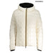 LONG SLEEVED GOOSE DOWN JACKET WITH HOOD, ECO STRETCH THERMO, REVERSIBLE WHITE/BEIGE, 2 EXTERNAL POCKETS, 2 INTERNAL POCKETS, CONTRAST DETAILS, APPLICATION, ZIP, LOGO