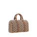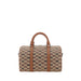 Boston Travel Bag by Moreau, two tubular leather handles, single interior compartment, zipper closure with double slider at top, iconic Moreaunette brand canvas repeated all-over, adjustable and removable shoulder strap.