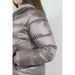 People Of Shibuya quilted down jacket in ultralight technical fabric with “pearl finish” treatment. 90/10 goose down filling. Inside bib snap closure, outside zipper closure with central double-slider die-cast zipper with gold finish and new round logo. Exterior pockets with zipper closure. Applied 3D lycra logo in color tone. Hood and bib in 70/30 wool. High-visibility reflective details.