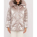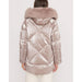 People Of Shibuya quilted down jacket in ultralight technical fabric with ‘pearl finish’ treatment. 90/10 goose down filling. Central double-slider die-cast zip with gold finish and new round logo. Bellows side openings with metal-effect die-cast zips. External welt pockets with invisible double snap button. Logo applied in 3D lycra in colour tone. High-visibility reflective details.