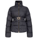 Pinko jacket made of beige quilted nylon, padded, padded high collar, with removable inserted hood, front pockets with snap buttons, matching waist belt, drawstring at bottom, double-slider zipper closure.
