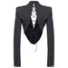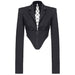 Pinko short blazer in black stretch viscose technical fabric, worked in fabric stitch with back opening, which leaves the back uncovered, closed by bodice-effect ties. Small lapel collar, long sleeves with buttons at the bottom and bustier silhouette with pointed garment bottom at the bottom. Lined. Hidden hook-and-eye closure in front