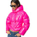 Pinko short padded down jacket in crystal nylon fabric, with a particular shiny, almost vinyl finish. Hooded collar, long low-set sleeves and bustier-style insert at the waist that tightens the volume. Lined. Covered zip closure and press studs on the hood.