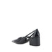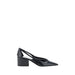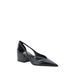 Leather Pumps by Prada featuring a patent leather design, an elongated toe, cut-out details at side panels, contrasting iconic brand monogram at side panel, a leather chunky heel, and a contrasting branded insole.