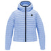 Refrigiwear light jacket in technical fabric, light blue in colour, with elasticated hood and genuine duck down padding. Open side pockets and front zip fastening.