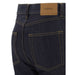 Cotton Jeans by Saint Laurent featuring a five-pocket straight fit, a mid-rise waist, a front button closure, waistband loops, and an iconic branded signature leather pressure-printed patch applied to the back.