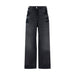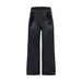 Cotton Denim Pants by The Attico, five-pocket baggy style, front button and zipper closure, waistband loops, double-layer waistband detail, iconic branded signature leather pressure-printed patch applied at back, vintage design, monochrome pattern.