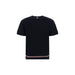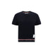 Thom Browne’s T-Shirt features a distinctive and refined design, featuring a ribbed crew neck that lends an elegant and comfortable touch. The two buttoned side vents and two buttoned sleeve vents add an element of functionality and style, typical of the brand’s attention to detail. The iconic logo patch applied to the front emphasizes the brand’s recognizable look, while colorful bands at the hem complete the look, recalling Thom Browne’s sporty and stylish aesthetic.
