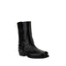 Leather Biker Boots by Valentino featuring a slight leather block heel, an appliquéd buckle strap at front and back with the brand’s iconic studs, a square toe, a smooth leather design, a double pull on the side panels, and a slip-on style.