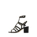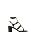 Calfskin Rockstud Sandals by Valentino Garavani, caged design with straps at front, closure by double adjustable ankle lap strap with side buckle, leather chunky heel, brand’s iconic all-over applied and gold-plated Rockstud studs, logoed insole.