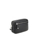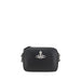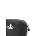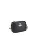 Anna Leather Shoulder Bag by Vivienne Westwood, grained leather design, zipper closure at top, adjustable and removable flat shoulder strap, one zippered welt pocket at back, distinctive three-dimensional plaque with contrasting Orb detail applied to front, single interior compartment.