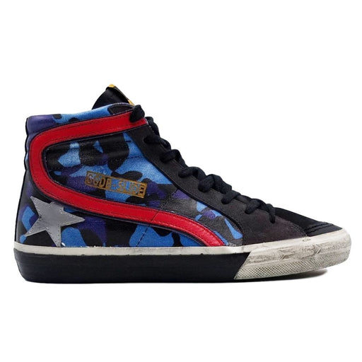 Original price $562.18Current price $513.06| /Golden Goose high top sneakers in calfskin with multicolored print, silver leather star, red leather comma, suede front, black laces, 100% leatherM...