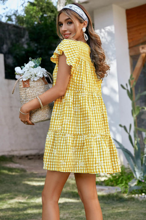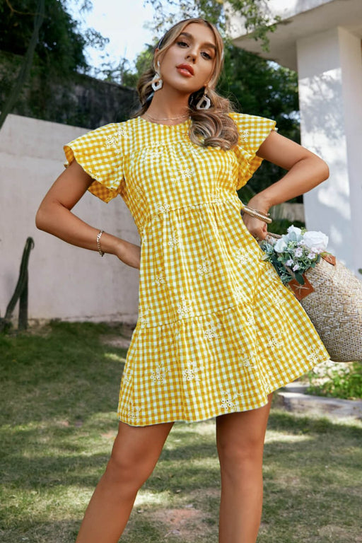 Plaid Floral Embroidery Flutter Sleeve Dress