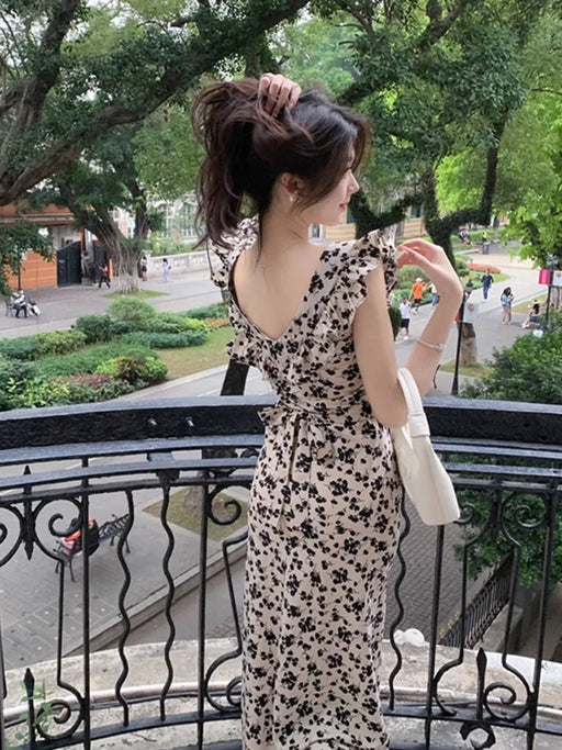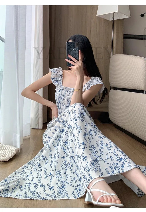 Print Midi Dresses for Women Flying Sleeve Cute Floral Vintage Ruffles Beach Maxi Bodycon Dress Summer