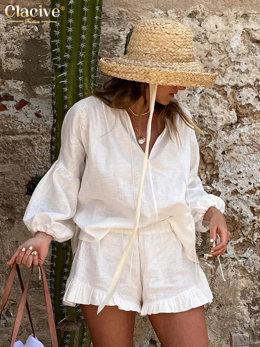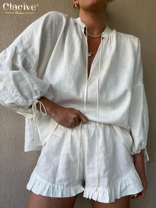 White Cotton 2 Piece Sets Women Outfit Elegant Lace-Up Puff Sleeve Shirt With High Waist Ruffle Shorts Set
