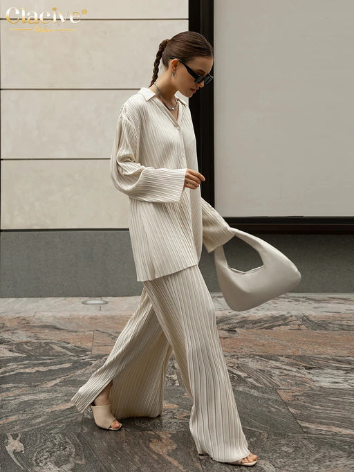 Fashion Long Sleeve Blouses Womens Two Peice Sets Casual Loose Slit Wide Trouser Suits Elegant White Pleated Female Set