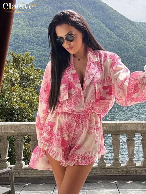 Fashion Loose Print Shorts Set For Women 2 Piece Elegant Long Sleeve Blouse With High Waist Ruffle Shorts Set Summer