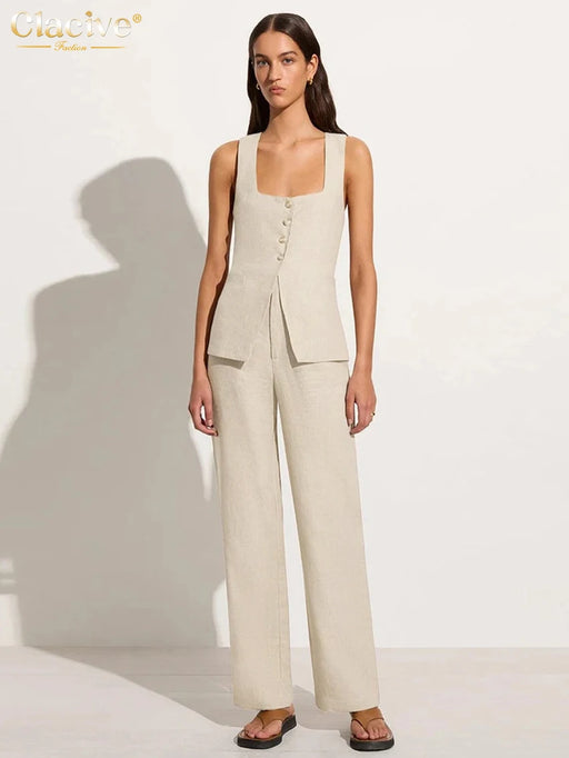 Summer Slim Khaki Linen 2 Piece Sets Women Outfit Fashion Sleeveless Tank Top With High Waist Pants Set Female