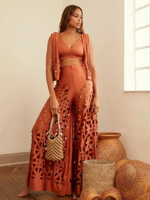 Two Piece Set Wides Legs Pants Elegant Solid Women Deep V Hollow Out Sexy Short Top Wide Leg Pants Suit