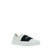 Calfskin Sneakers by Givenchy, slip-on style, a round toe, a press-stamped logo on the front tongue, a contrasting branded iconic monogram band applied to the front, and a platform sole.