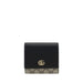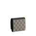 Leather Wallet by Gucci, trifold design, front closure by magnetic flap, all-over printed iconic GG Supreme brand logo, three-dimensional iconic brand logo plaque applied to the front, interior bill compartment, card slot, zippered coin pocket for closure.